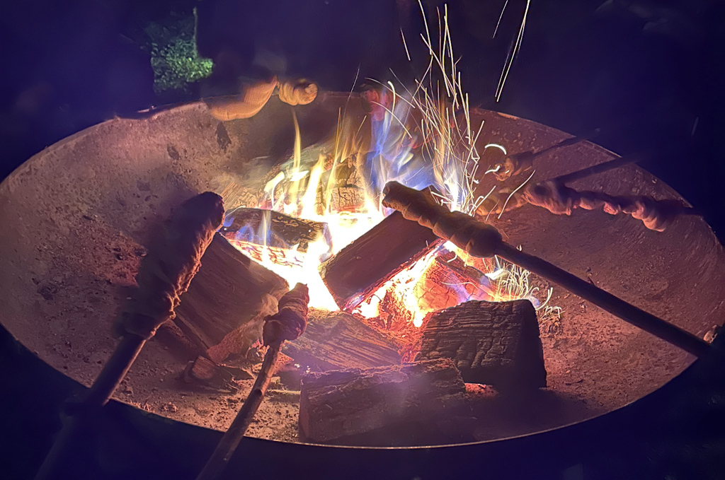 Eltern, hielten lange Stöcke mit klebrigem Stockbrotteig ins Feuer und lachten.
